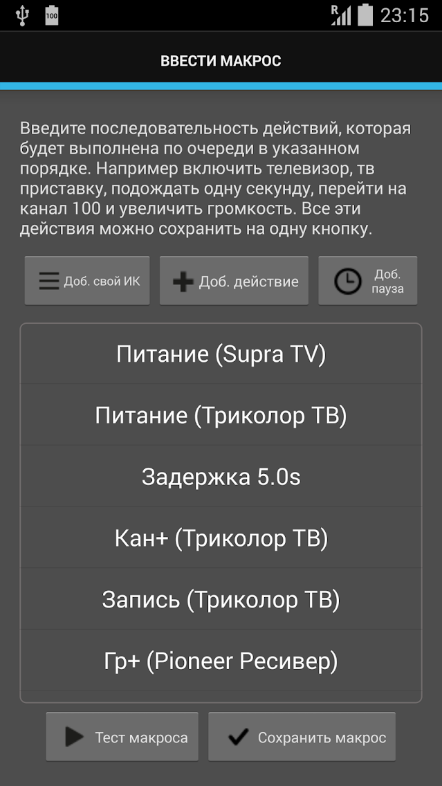 При этом настройка приложения не требует каких-либо особых навыков или знаний. Единственное, что необходимо пользователю — выбрать нужный тип и марку устройства в предлагаемом разработчиками списке. При этом уже составленный список можно дополнять и обновлять, а функция сохранения пресетов позволит вам объединить все домашние ПДУ в одном устройстве. При этом, в отличие от аналогичных приложений, данный виртуальный дистанционник будет поддерживать большую часть функций родного ПДУ.