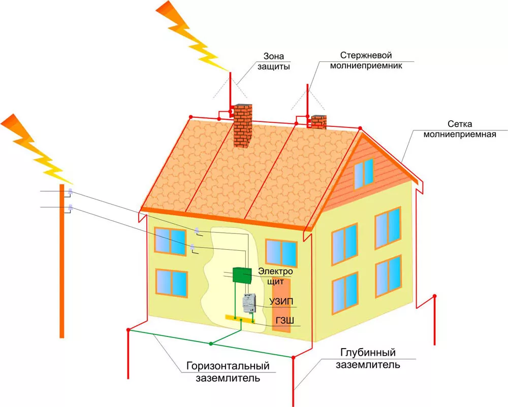 Внешняя молниезащита представляет собой систему, обеспечивающую перехват молнии и отвод её в землю, тем самым, защищая здание от повреждения и пожара.
